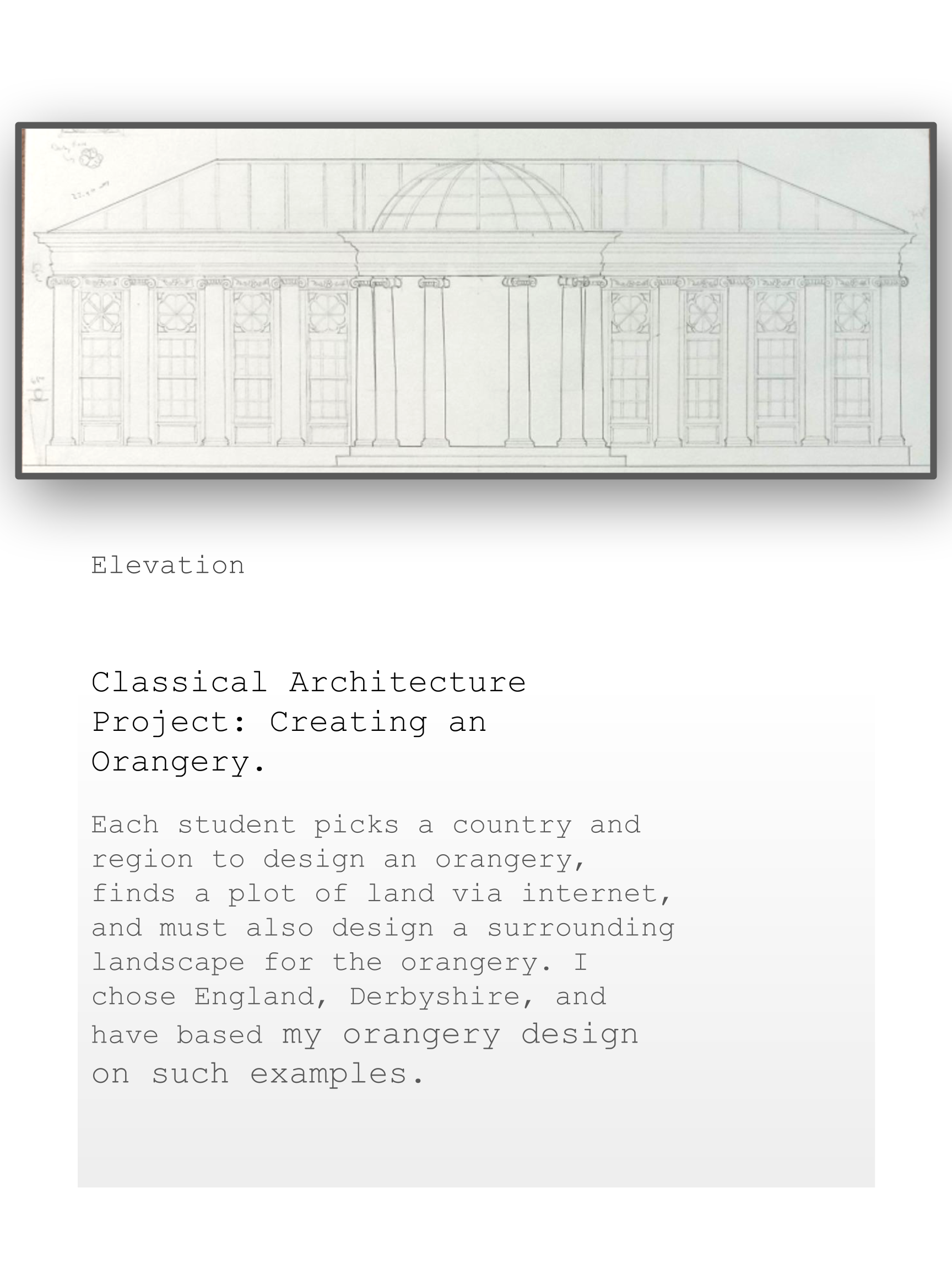 Portfolio Gallery Jonah Jackson Architectural Drafting – Freshman, Semester II: The Orangery Architectural Drafting – Freshman, Semester I: The Aedicule Analytique, Half-Scale Preliminary Design I Esquiesses Preliminary Design II Critique Presentation II Critique Presentation I Final Analytique Miscellaneous – Personal, Commissioned Works Secret Relief Ancient Snake Head Display Creature Pedistal Walk and Talk Wanted Prowlers Kingpin Dragon “Show You Something” Self Portrait – 2019 Sloth-Dino Mangrove Forest Glowing Creatures Lemur Concept “Dragon” Character Concept Early Environment Concept